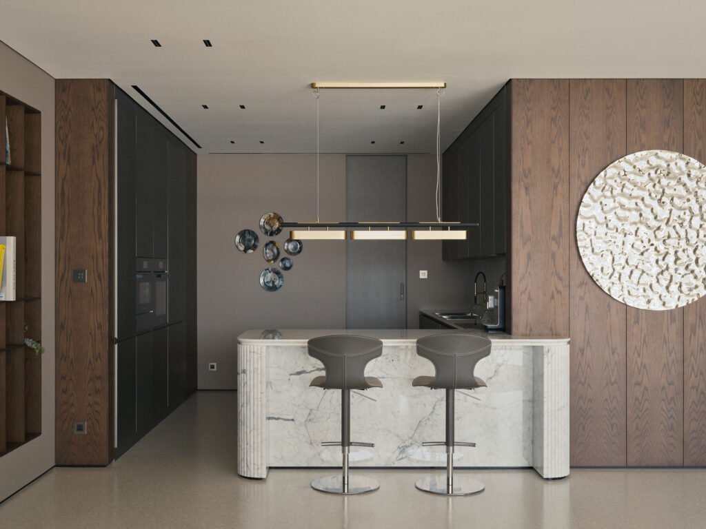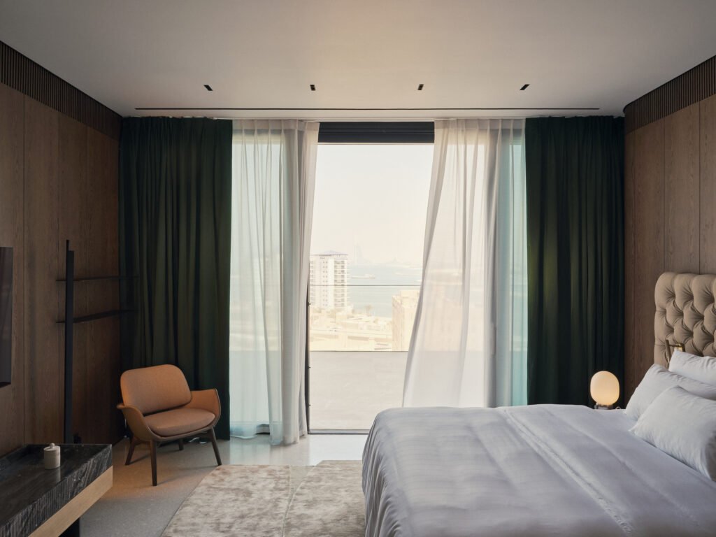 The scope included full interior fit-out works, custom joinery, flooring, lighting, and high-end material finishes throughout the apartment. A balanced palette of premium textures and finishes was used to create a sophisticated and comfortable environment that enhances the waterfront lifestyle of Palm Jumeirah.